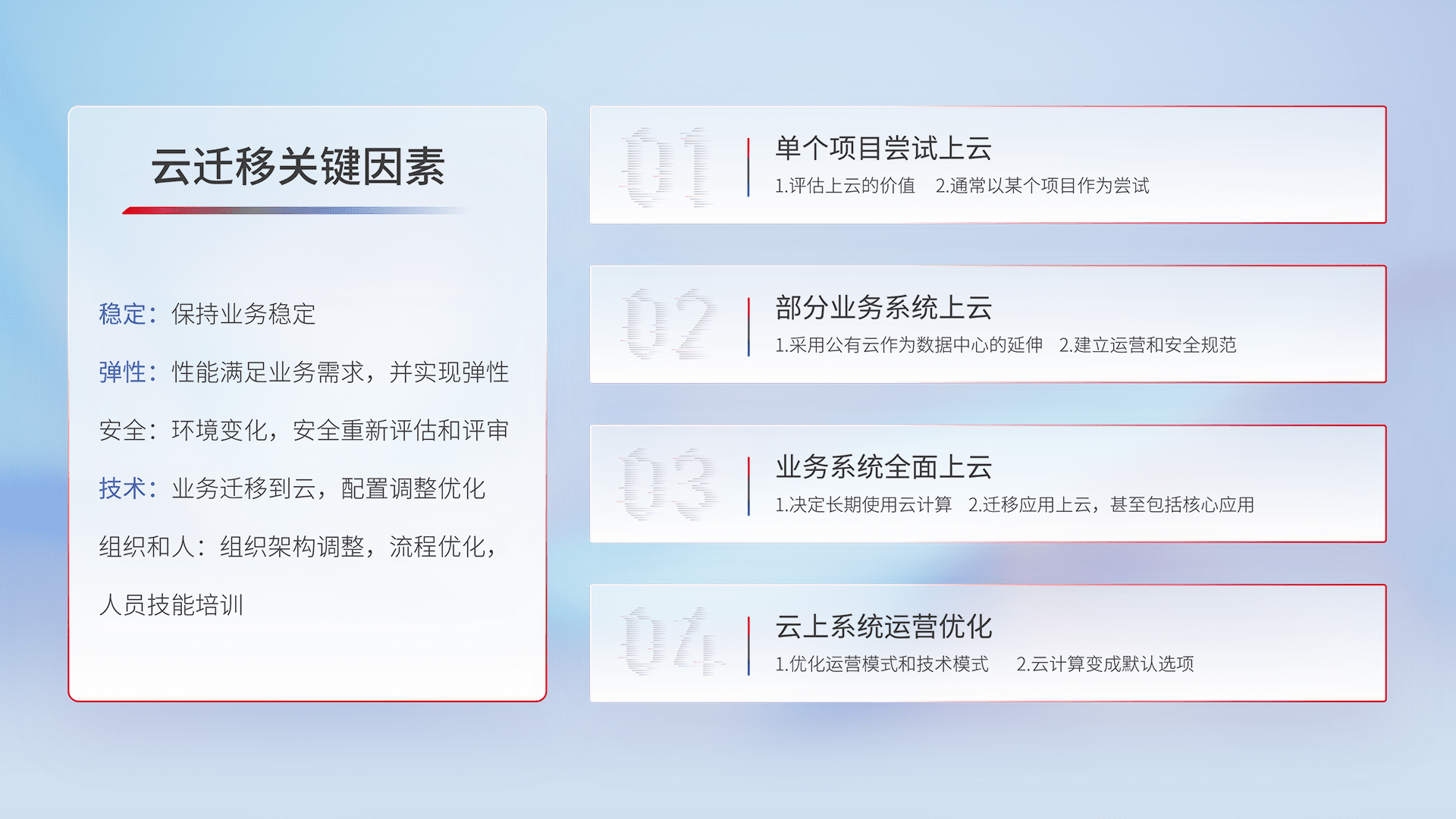 结合实际业务,,,从规划设计、、、云平台选型、、、云原生改造、、、、数据迁移、、、集成交付,,迁移全过程为客户识别最佳上云路径,,做好风险识别管理,,设计网络架构、、、、身份权限、、、安全审计合规、、、、操作审计、、日志审计、、、监控告警策略、、多站点容灾设计等,,,,对云上基础设施进行整体规划,,,提升IT治理水平,,以满足弹性、、、高可用、、高性能的需求。。