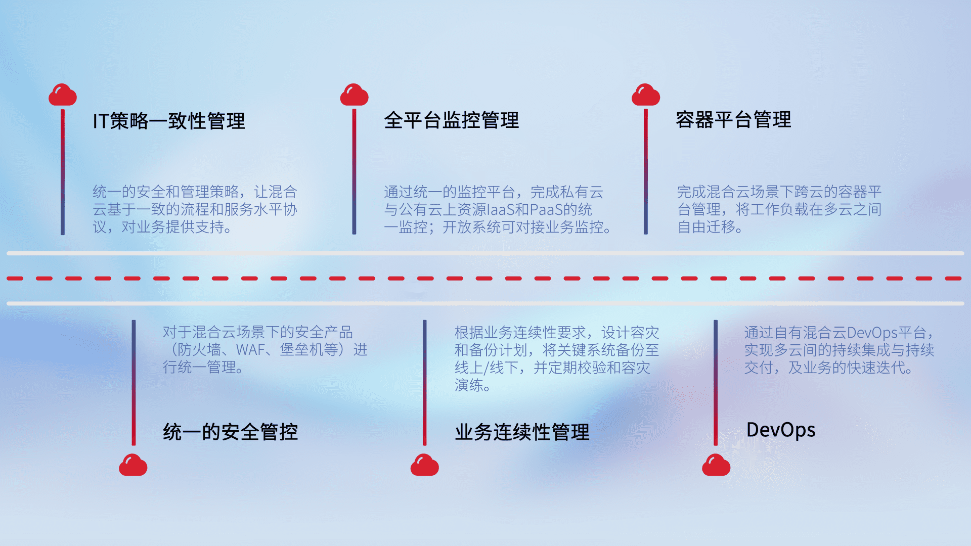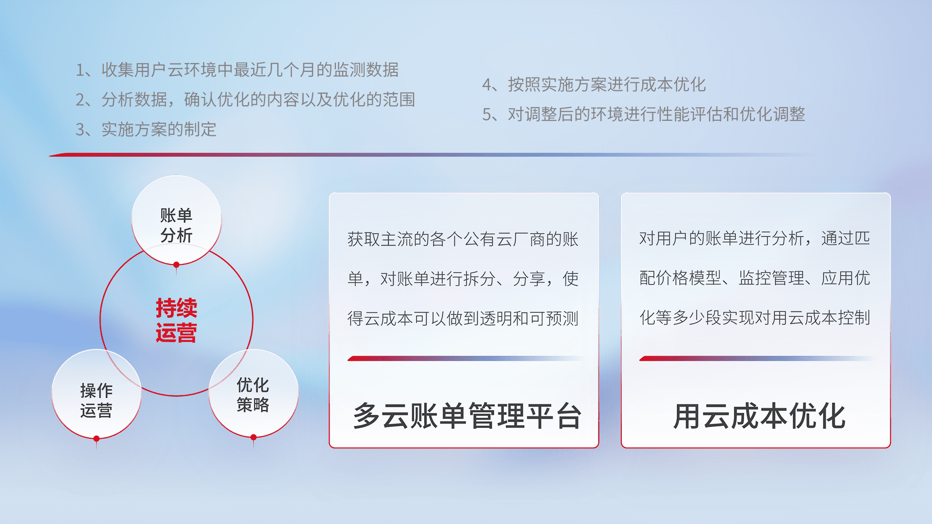 通过多云纳管,,,以统一的资源数据模型把客户的云资源进行抽象和封装,,,进而实现对多云资源的统一操作,,,保障云资源管理的可靠性、、、、稳定性与可用性。。。量身定制化运维内容,,配置、、开发运维、、、、补丁管理、、、、备份、、、监控、、、认证和访问管理、、审计和日常巡检等,,,保障在用云过程中的可靠度,,,稳定度以及高可用率。。。