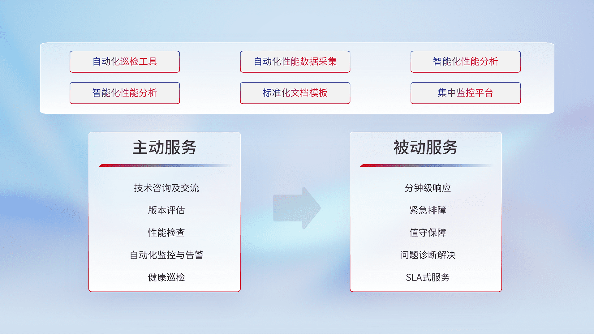 智能化工具和标准化文档,,保障服务质量,,提供主动服务(包含技术咨询、、、、版本评估、、、、性能检查、、、、自动化监控与告警、、、健康巡检)和被动服务包含(分钟级响应、、紧急排障、、、值守保障、、、、问题诊断解决、、、、SLA服务)。。。