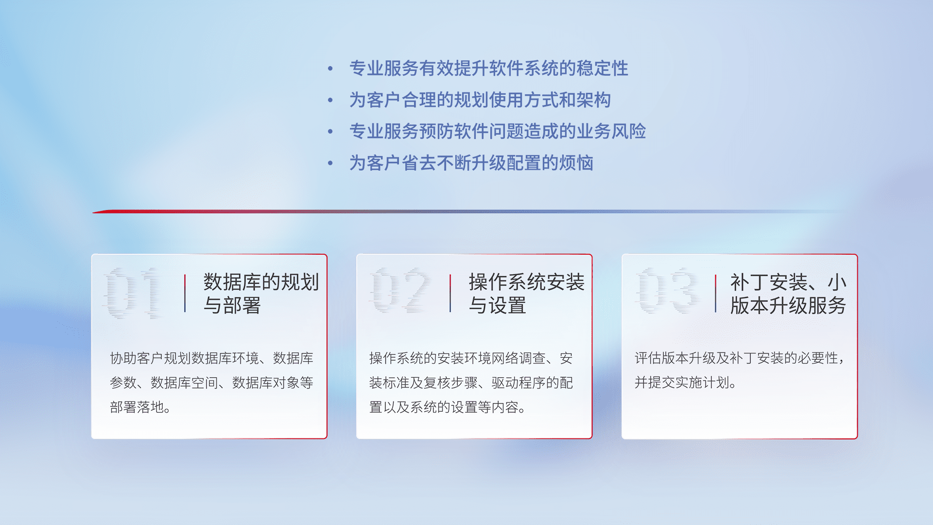 为客户提供软件规模升级、、、、快速部署、、、、按需配置的专业服务,,,从数据库的规划与部署到操作系统的安装与设置,,再到补丁安装和小版本升级提供支持。。